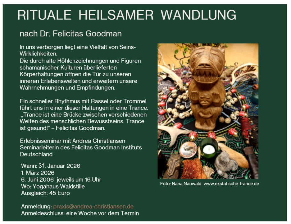 Yogahaus Waldstille Hauptstr. 42, Winsen (SH), DeutschlandKlangabend Erlebe eine Klangreise der Elemente. Die fünf Elemente – Erde, Wasser, Feuer, Luft und Äther – stehen im Zentrum dieses Abends. Jeder dieser Urkräfte wird durch spezielle Klänge und Instrumente repräsentiert, die die Schwingungen und Energien der Elemente zum Ausdruck bringen. Lasst uns den Abend beginnen, mit einer rituellen Einführung, bei der Ihr in […]